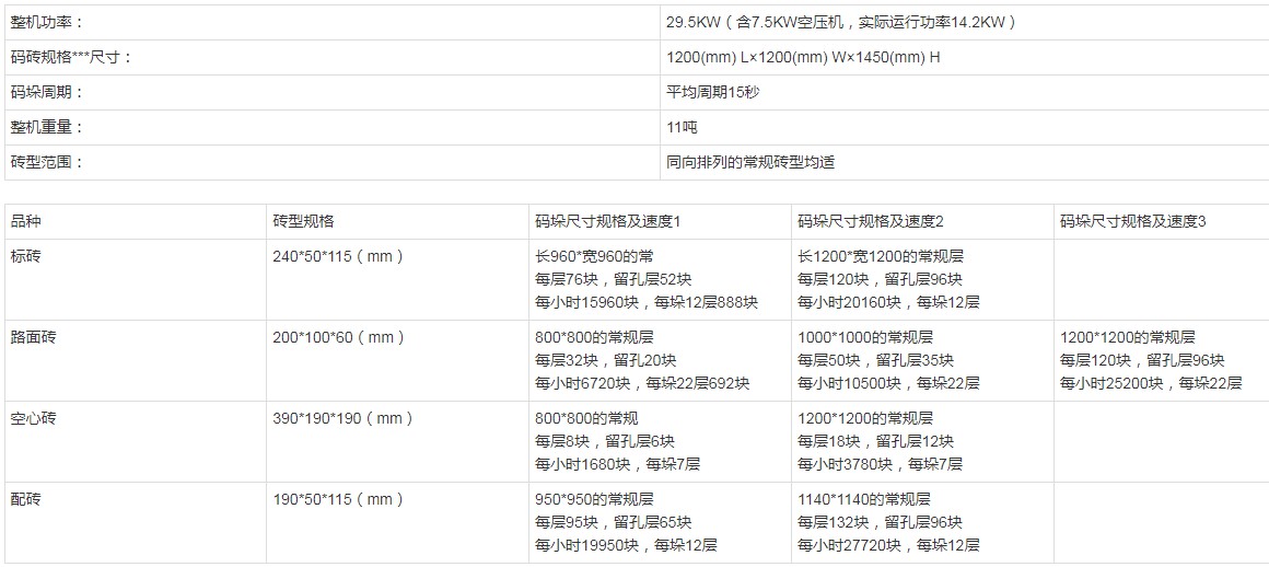 二、YH1200型 全自動碼磚機(jī)系統(tǒng)主要參數(shù):
